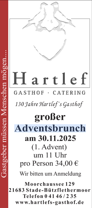 Wir sind ein familiär geführter, traditioneller Gasthof im Bützflethermoor vor den Toren von Stade. Unsere Speisekarte weist regionale, schmackhafte Gerichte auf. Im Angebot stehen Geburtstage, Bälle/Festlichkeiten und Sonderaktionen wie Brunch und Buffet (siehe unten) und überhaupt Feiern jeder Art. Unsere fünf gemütlichen Räume, die individuell kombiniert werden können, bieten Platz für bis zu 200 Personen.